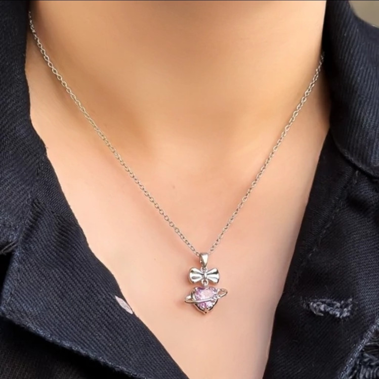 ترکیب قلب کریستالی و پاپیون ظریف در کنار زنجیر، استایلی به شما میده که انگار همین الان از دل عکسهای ژورنالی بیرون اومدید! ✨ لایههای نقرهای که با هر حرکت شما میدرخشن.
