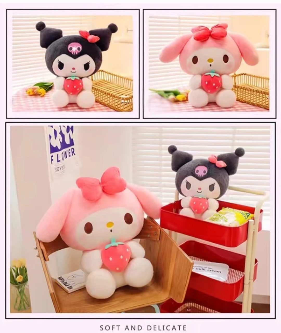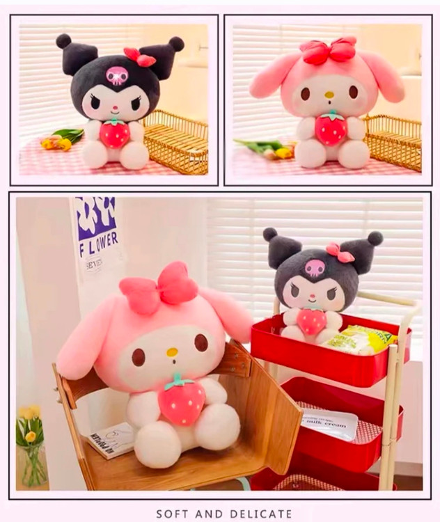 ترکیب شخصیتهای محبوب سانریو با توتفرنگیهای شیرین! این عروسکهای اورجینال با لباسهای توتفرنگی، انقدر نرم و دلبر هستن که دل هر کسی رو میبرن. یه هدیه پرنسسی و خاص برای دخترای خوشسلیقه! 🌸✨